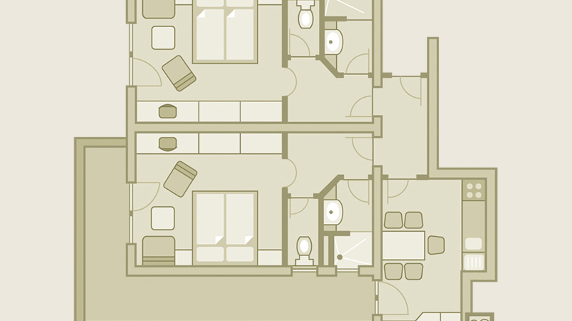 Vorraum, 2xSchlafzimmer jeweils 2-4Betten mit jeweils 1xDusche und 1x WC, 1xWohnraum (20 m²) mit ausziehbarem Doppelbett, Essecke mit Küchenblock, Safe, jeder Raum mit Kabel-TV, Telefon und großem Balkon plus WLAN plus Parkplatz. Verschiedene Raumaufteilung und Design.